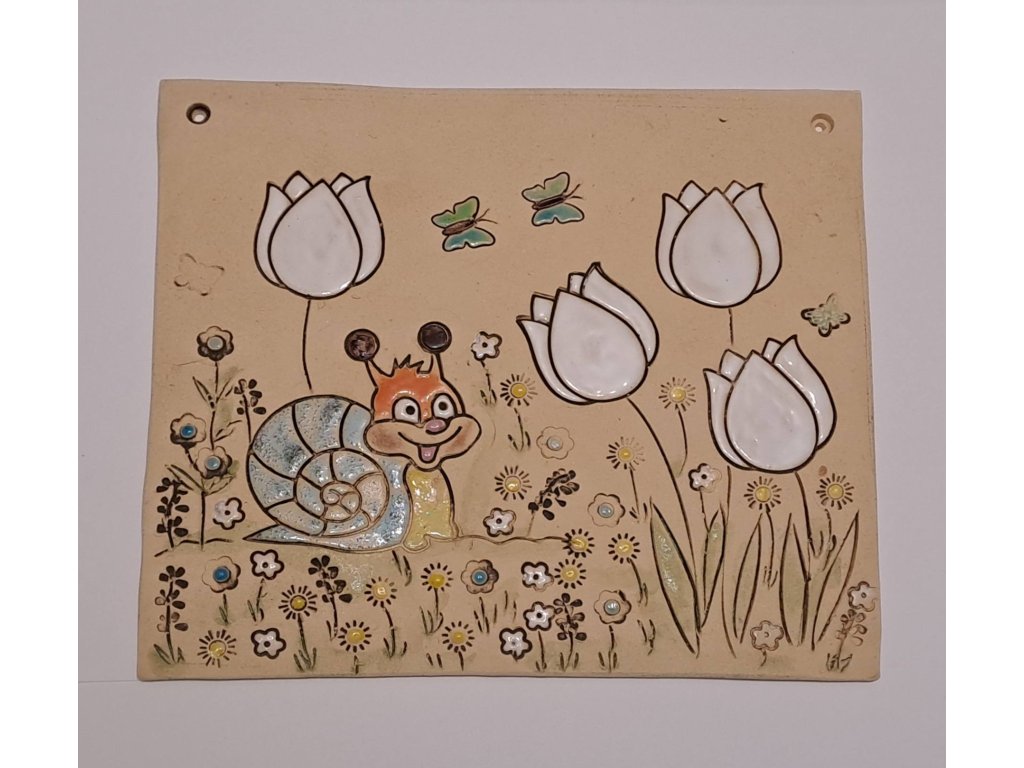 Keramický obrázek se šnekem na rozkvetlé louce