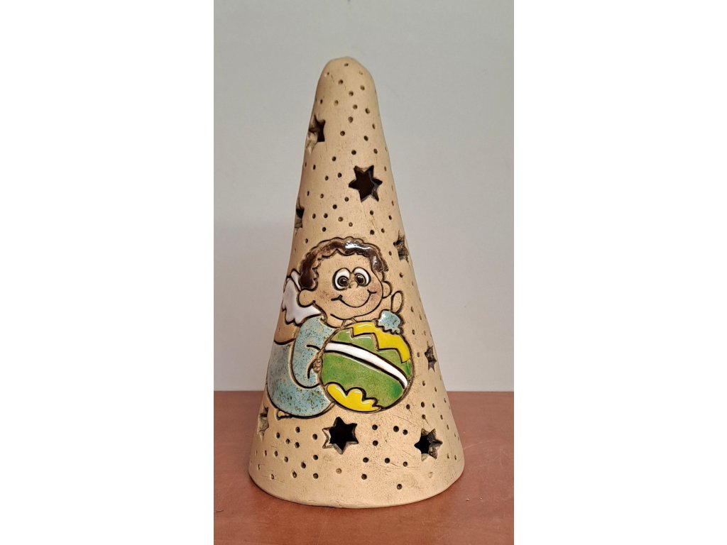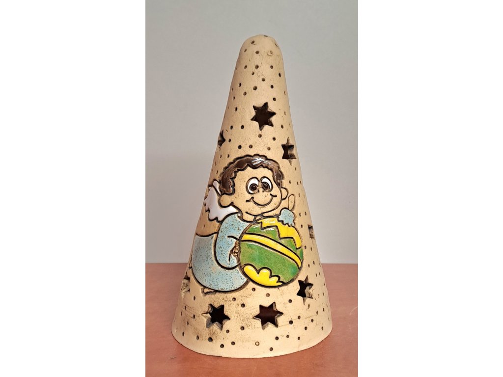 kužel s obrázkem anděla nesoucího vánoční ozdobu